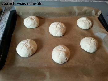 - Ein Backblech mit Backpapier auslegen, die Brötchen darauf setzen und einschneiden. Dann in warmer Umgebung ca. 1h gehen lassen.